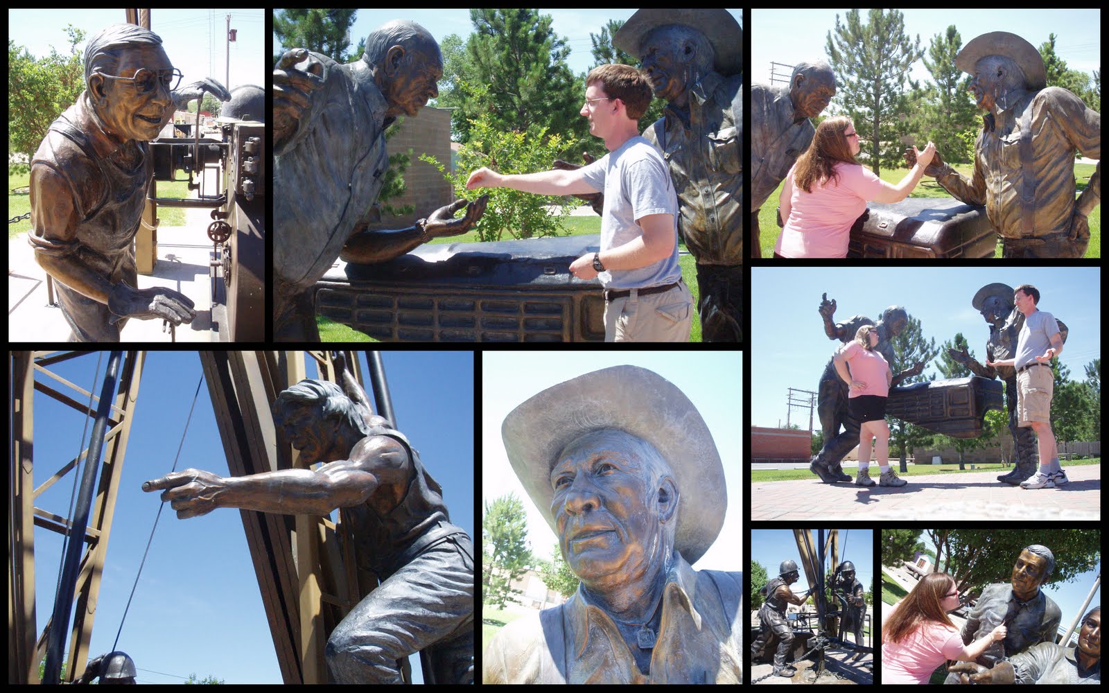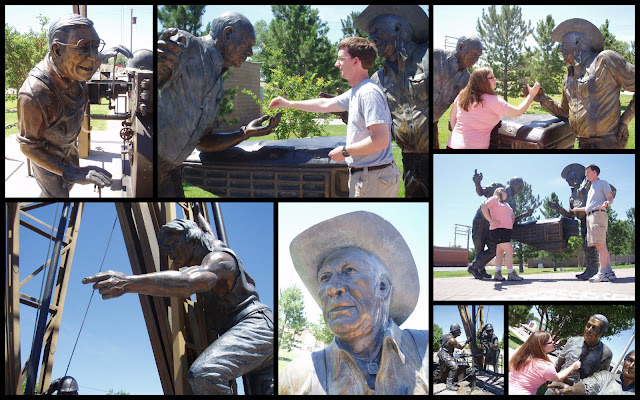 We drove through Artesia, New Mexico Saturday morning on our way to Alamogordo. There are many HUGE bronze sculptures throughout the city. When we can across the largest in the town square, we finally gave in and stopped. The main sculpture is a section of an oil derrick (about 20 feet tall). One smaller piece nearby shows pioneers while the other shows two wildcatters talking on the hood of a pickup truck.