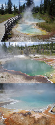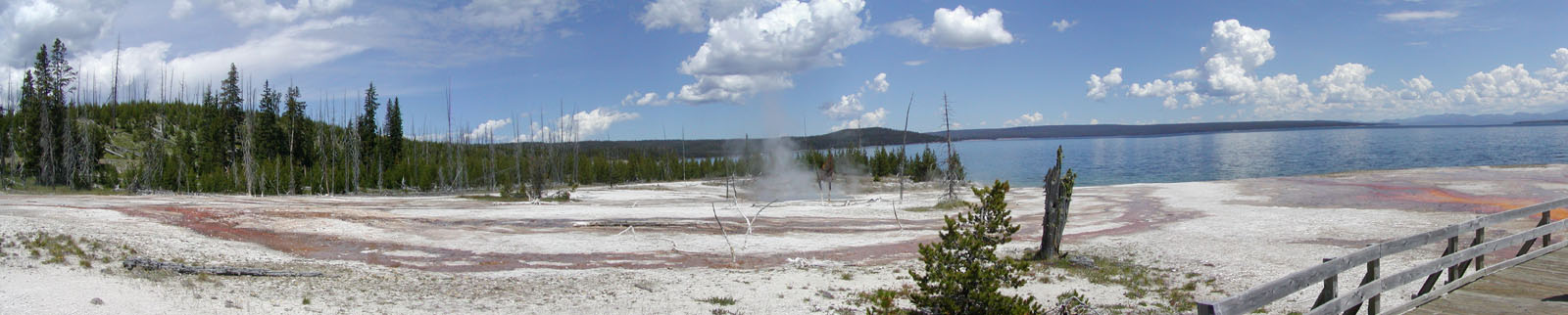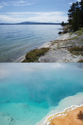 We left Canyon this morning and drove to the Mud Volcano area. Along the way we saw a large heard of bison sauntering through Hayden Valley. We then went over to the West Thumb Geyser Basin. I don’t remember visiting this area before, but it was amazing. This basin is nestled right along Yellowstone Lake. This makes for beautiful color combinations — the green trees and grass, deep blue water, rust colored thermophiles, chalky white dirt… it was well worth the trip. There are many hot springs here that exhibit the deep greens and blues that Morning Glory Pool is known for, but these features do not show the signs of vandalism that you see at the Lower Geyser Basin. The pools and other features here at West Thumb are concentrated very close together as well, which means less walking.