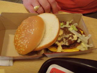We got our order and sat down, and Diana discovered that her Big Mac was mis-assembled. (See photo!) She wasn’t sure whether or not she should send it back (after all, the parts were all there… just in the wrong order). I offered to take it back for her, and she let me. I showed the employee what was wrong and asked if we could get a new one. He turned around and had a new one made. He handed me a fresh Big Mac (yes, I witnessed that it was a new one) and I returned to my table. Diana opened it and discovered the new burger was made exactly the same way!